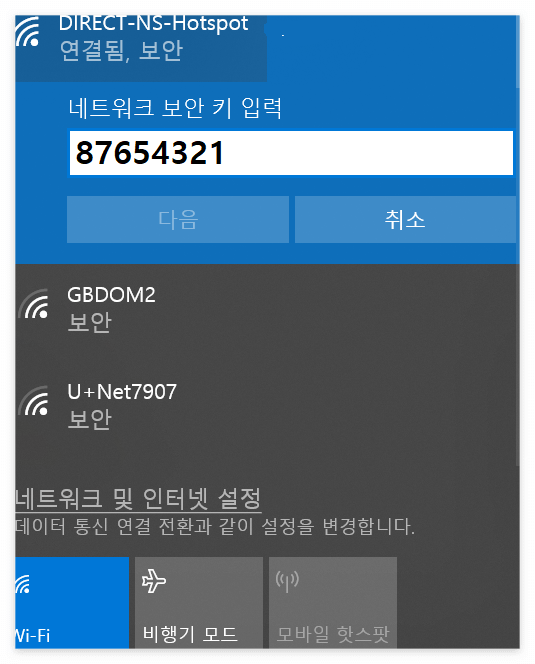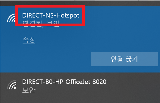 와이파이를 켜니 화면과 같이 DIRECT-NS-HOTSPOT 와이파이가 보였습니다.