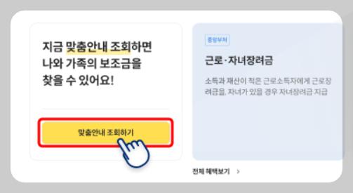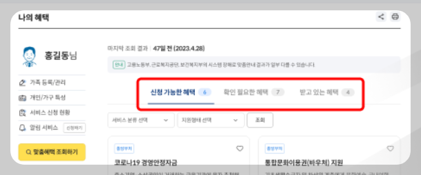 4.맞춤안내 조회가 완료되면 받을 수 이쓴 보조금 이미받고 있는 보조금 정보를 확인하고 보조금24에서 바로 신청할 수 있어요.