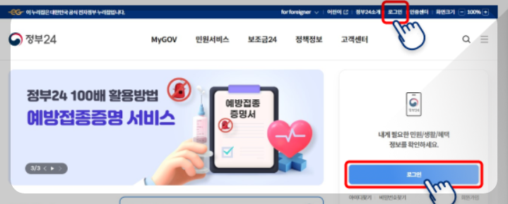 1. 정부24 회원일 경우에는 로그인을 진행하여 본인인증진행합니다. 비 회원일 경우에는 회원가입을 진행합니다.