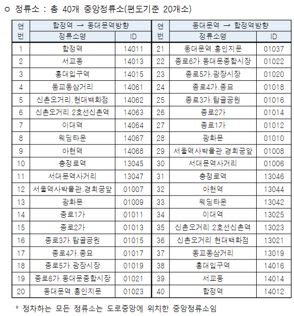 서울시는 4일(월) 첫 선을 보이는 심야 자율주행버스는 대학가, 대형 쇼핑몰 등이 밀집하여 심야 이동이 많은 합정역~동대문역 중앙버스전용차로구간 9.8km을 순 환 하게 되 며 , 일반 시내버스와 동일한 규격의 대형전기 자율주행버스(현대차 일렉시티 개조) 2대가 운행합니다.