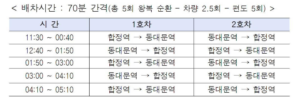 서울시 심야 자율주행버스 운행요일과 시간은 월요일부터 금요일까지 평일만 운행하며 늦은 밤 11:30분 운행을 시작하여 다음날 05:10분 종료된다. 1대는 합정역, 1대는 동대문역에서 밤 11:30분에 각각 출발하여 70분 간격으로 순환 운행합니다.