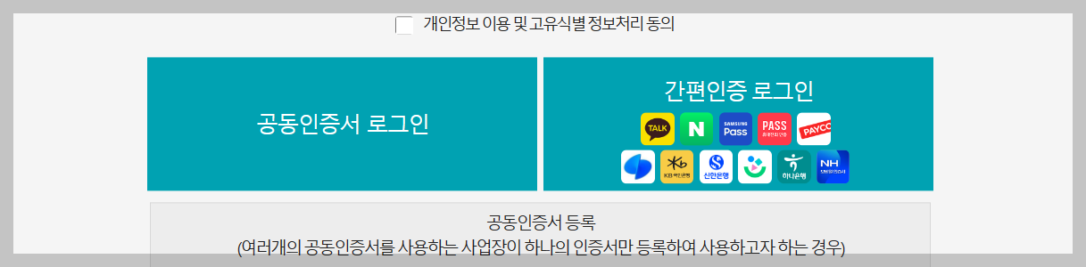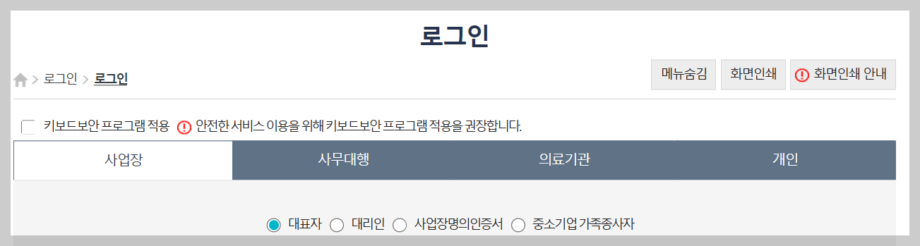 3. 대표자,대리인, 사업장명의 인증서 사용하고자하는 인증서를 선택하여 로그인을 진행합니다.