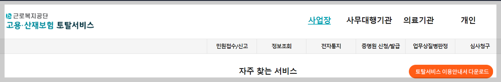 1.먼저 소상공인(자영업자)고용보험 가입하기위해서 네이버포털이나 구글포털 다음포털에 고용산재토탈서비스를 검색하여 홈페이지에 접속하것나 위 고용산재토탈서비스 링크를 통해 홈페이지에 접속합니다.