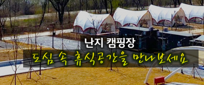 서울시에서 운영하고 있는 난지캠핑장은 다양한 캠핑 문화를 즐길고 소중한 사람들과 소중한 추억을 간직 할 수 있는 곳으로 프리캠핑존, 바비큐존, 일반캠핑존, 글램핑존, 캠프파이어존을 운영하고 있습니다. 난지캐핑장의 시설은 2만 7,000㎡면적으로 2021년 4월 전면 리모델링하여 대여 공간의 면적을 늘리고 캠핑간의 밀집도를 낮추어 다양한 시설을 조성‧배치하여 총 900명의 인원을 수용 할수 있으며 프리캠핑존 36면 , 바비큐존26개소, 일반캠핑존 83면, 글램핑존 5면, 캠프파이어존5개소 캠핑사이트를 갖추고 있으며 실개천1개소, 야외무대1개소 화장실 3개소, 샤우실 2개소 식수대3개소로 기반시설을 갖추어진 도심속 휴식공간 난지캠핑장에서 다양한 즐거움을 만날수 있습니다.