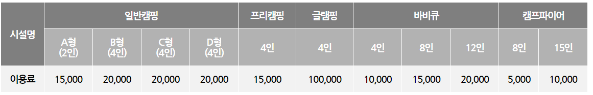 | 캐핑장사이트 | 이용시간 | 기타 |