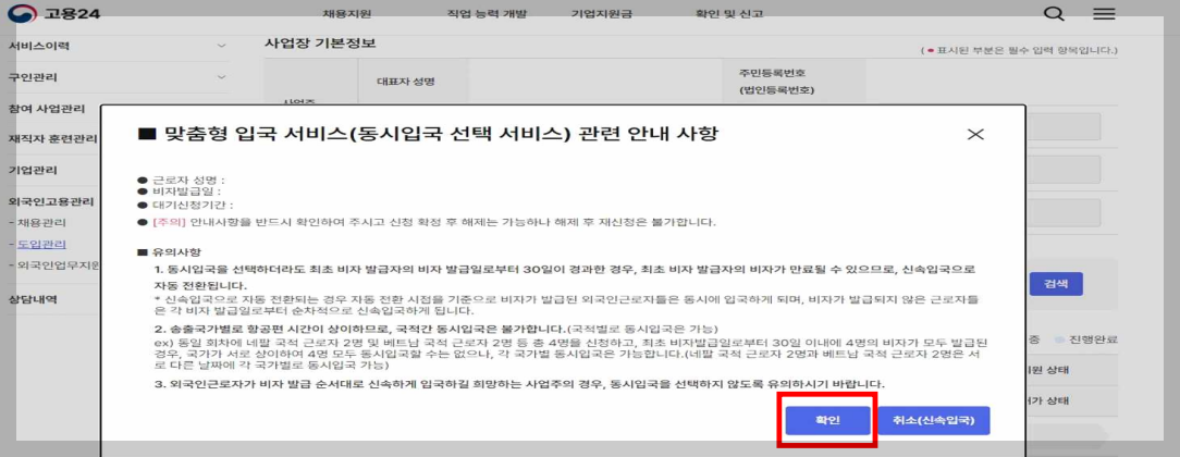 4.‘동시입국’ 버튼 클릭 시 팝업 안내문 보임 → ‘확인’ 클릭(취소 클릭 시 창 닫힘) → 재확인 창에서한번 더 ‘확인’ 클릭(취소 클릭 시 창 닫힘)