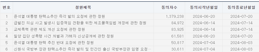 국민동의청원 홈페이지 6월 청원된 윤석열 대통령 탄핵소추안 즉각 발의 요청에 관한 청원에 138만명청원에 동의하였습니다. 22대 국회법사위는 윤석열탄핵 소추안건에 대한 청문회를 7월중으로 39명을 증인으로 채택하여 17일과 19일 청문회를 개최 할 예정입니다. 39명의 증인명단에는 국방부장관외 영부인까지 포함되어 있으며 증인들의 출석여부는 정확히 알수 는 없으니 청문회 개최날 확인이 가능 할거라 생각합니다. 이와 반대로 7월4일 윤석열탄핵반대 추진 요청에 관한 청원이 작성되어 현재 5만명이 동의하여 청원에 관한 성립조건이 이루어졌으며 윤석열탄핵반대 동의기간은 2024년8월3일 대한민국 국민이며 누구나 동의에 참여 할 수 가 있습니다.