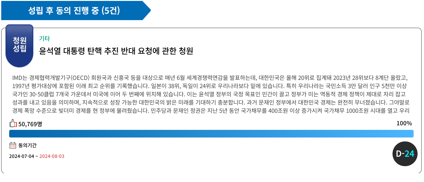 국민동의청원홈페이지 작성된 청원은 5만명의 동의받아 성립요건이 갖추어져 청원서 공개 이후 30일 이내 청원서에 대한 동의를 받을수 있습니다. 이는 2024년07월04일 부터 2024년08월03일까지 대한민국 남녀노소 누구나 청원서에 동의를 진행 할 수 가 있습니다. 그러나 동의를 진행하기위해서 본인임을 증명할수 있는 본인인증 절차에 따라 본인인증을 진행하여야 동의에 진행 할수 있습니다. 본인인증이 이루어지지 않을 경우 윤석열탄핵반대 청원에 동의를 할 수 가 없습니다. 이점 유의하시 바랍니다.