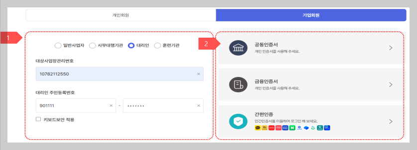 고용24 채용 민원대리인 선입신고는 일반 사업자만 가능하며 기업회원 로그인 인증수단은 공동인증서 금융인증서로 이용가능하며 사업자용으로 발급된 인증서만이용가능하오니 이점 유의하시기바라며 세금계산성용 특수목적 인증서는 불가하오니 인증서가 없는 기업회원께서는 기업용 인증서를 발급 받의시기 바랍니다.