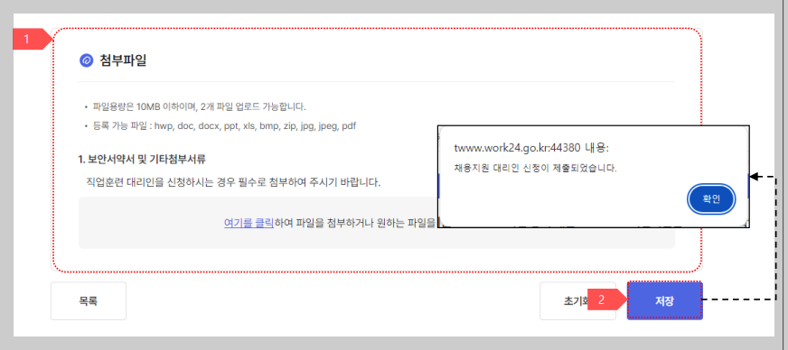 첨부파일은 직업훈련 대리인을 신청 할 경우에만 피루로 보안서약서를 첨부해주셔야합니다. 채용업무 대리인의 경우 첨부를 하지 않으셔도 됩니다. 저장버튼 클릭시 채용업무 대리인의선임이 완료됩니다. 채용업무대리인은 고용센터의 승인없이 바로 이용이 가능합니다.
