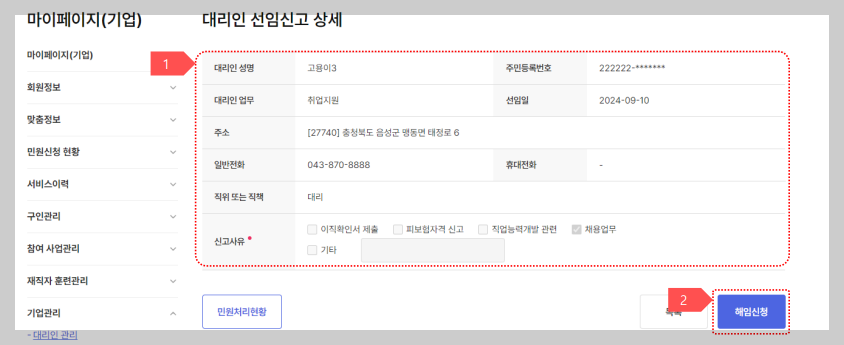 민원대리인 상세조회로 선임한 대리인의 상세정보를 조회하거나 해임하고자 할경우 해임신청 버튼 클릭시 해임신청이 완료됩니다. 채용업의 경우 해임신청시 고용센터 승인절차없이 바로 해임 처리되오니 이점 유의하시기 바랍니다.