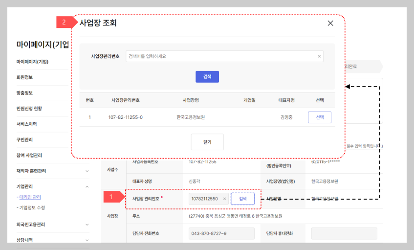 검색버튼을 클릭하여 대리인을 선임할 사업장 목록을 조회 할 수 있으며 사업장조회시 대리인을 선임할 사업장(사업장 관리번호)을 선택하여 대리인을 신청합니다.