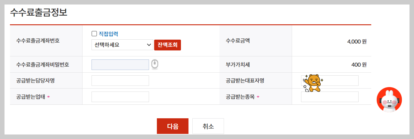 5. 사업자 범용일경우(금융및 세금계산서발행용) 수수료가 발생함으로 수수료계좌 및 비밀번호 기타 내용을입력하니다.