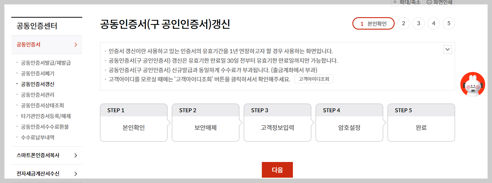 3. 범용 공동인증서 갱신에 대한 STEP 단계를 확인하여 다음을 선택합니다.