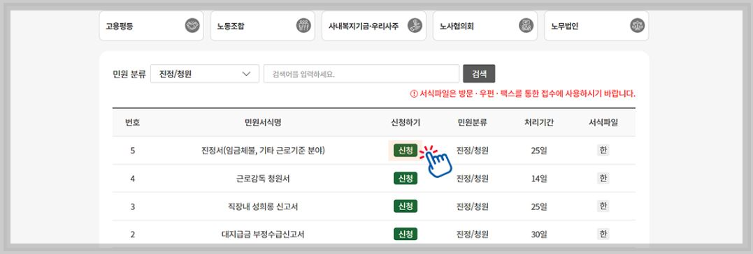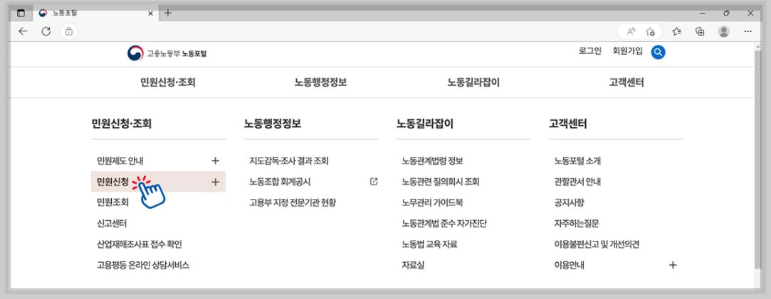 1. 노동포털 민원신청 · 조회의 '민원신청' 클릭