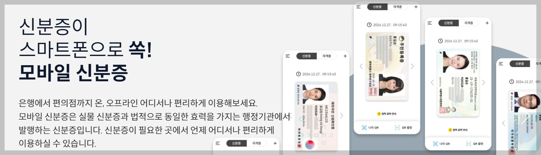 신분증이 스마트폰으로 쏙 들어오는 모바일신분증은 은행에서 편의점까지 온 오프라인 어디서나 편리하게 이용가능하며 모바일신분증은 실물 신분증과 법적으로 동일한 효력을 가지는 행정기관에서 발행하는 신분증입닏, 신분증이 필용한곳에서 언제 어디서나 편리하게 이용 하실수 있습니다.