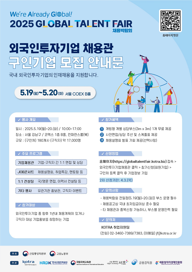 2025년 GLOBAL TALENT FAIR의 외국인투자기업채용관 구인처 모집이 개시되어 외투기업 대상 참가 안내드리니 관심기업은 참가신청 바랍니다. (모집마감 : (1차) 3월 14일 / (2차) 4월 3일) 자세한 사항은 외국인투자기업 채용박람회 홈페이지 첨부 기업모집안내문 참고해주시기 바랍니다.