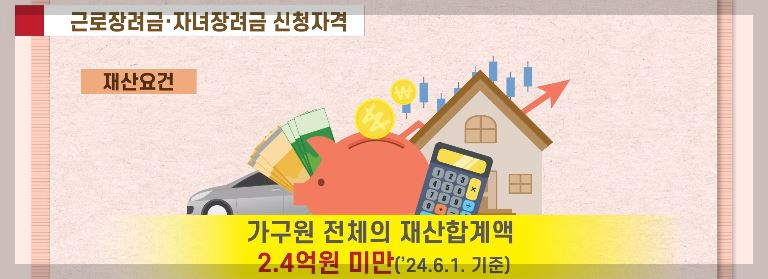 2025년 근로장려금 자녀장려금 재산요건은 가구원 전체의 재산합계액이 24년 6월1일기준 2.4억원미만이어야합니다. 포함되는 재산은 주택,토지,건출물(시가표준액) 승용자동자(시가표준액, 영업용은제외), 금융자산, 전세급,유가증권 회원권,부동산취득 할 수 있는 권리입니다. 주택 Min(간주전세금(기준시가 ×55%), 실제전세금), 직계존비속에게 임차한 경우 해당주택기준시가의 100%간주전헤금 적용, 임대차계약서 적용배제(상가) 실제 전세금으로만 평가합니다. 요구불예금의 경우 6.10이전 3개월 평균잔액으로 재산가액에서 부채는 차감하지 않습니다.
