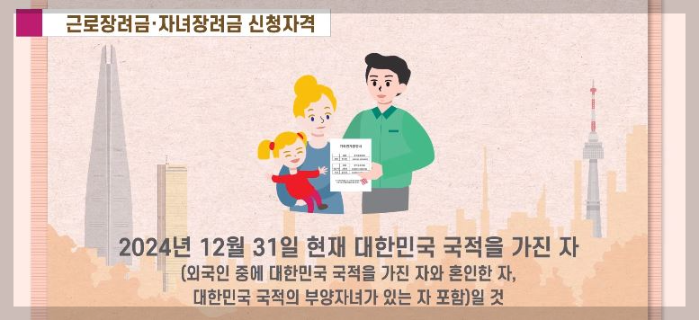 힘이되고 지원희망이 되는 근로장려금. 자녀장려금 놓치지 마세요 !! 2025년 근로장려금 자녀장려금이란 근로자가 일을 하지만 소득이 적어 생활이 어려운 근로소득 사업소득 또는 종교인들이 있는 가구에 근로, 자녀장려금을 지급함으로써 근로를 장려하고 실질속득과 자녀양육을 지원하는 복지제도입니다. 2025년 근로장려금 신청방법은 총6가지 방법이 있으며 그 중 본인이 안전하고 편안한 방법을 선택하여 진행하시면 됩니다. 2024년 12월31 현재 대한민국 국적을 가진자 (단 외국인 중에 대한민국 구적을 가진자와 혼인한자, 대한민국 국적의 부양자녀가 있는자 포함)일것, 2024년중 다른 거주자의 부양자녀가 아닐것, 거주자(배우자포함)가 전문직 사업을 영위하고 있는자가 아닐것, 2024년 12월31현재 계속 근무하는 사용근로자(일용근로자 제외)로서 월 평균 근로소득500만원 이상인자가 아닐것(근로장려금만 해당됨).