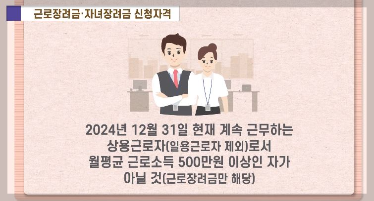 2025년 근로장려금 신청자격은 2024년 12월31일 기준으로 단독가구, 홑벌이가구, 맞벌이가구로 나늬어지며 단독가구는 배우자,18세미만 부양자녀, 70세이상 직계존속이 모두없는 가구에 대상되면 홑불이가구는 배우자(총급여액이 3백만원미만)나 18세미만 부양자녀 또는 70세이상 직계존속(각각 연간소득금액 1백만원 이하)이 있는가구 맞벌이가구는 신청인과 배우자 가각의 총급여액등이 3백만원 이상인가구를 말합니다.