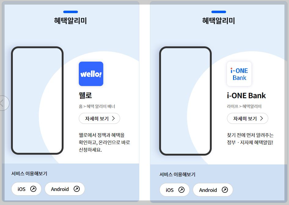 혜택알리미 전에는 혜택을 일일이 검색하거나 받을수 있는 없는지 스스로 판단하거나 신청시기를 놓칠수 있으나 혜택알리미는 평소사용하는 앱으로 정부혜택을 알아서 신청시기에 맞춰 안내 해드리며 한번가입으로 평생알림을 받을 수 있습니다. 모바일 앱 사용이 어려운 부모님은 부모님혜택을 자녀나 또는 다른가족이 확인 할 수 있습니다. 혜택알리미는 직접 검색하는것보다 아래 혜택알리미 다운로드를 통해 쉽쉬게 안전하게 다운로드 앱 시작하기 하시기 바랍니다.