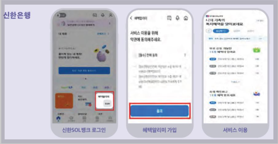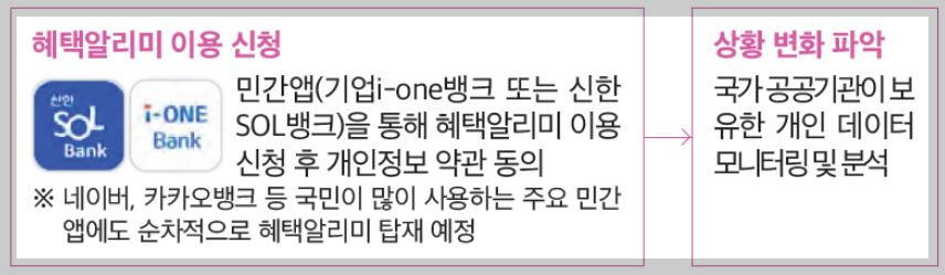 혜택알리미 이용신청은 민간앱 기업및 신한 뱅크을 통해 혜택알리미 이용 신청후 개인정보 약관동의후 이용할 수 있으며 네이버 카카오뱅크등 국민이 많이 사용하는 주요민간 앱에도 순차적으로 혜택알리미 탑재 예정입니다.