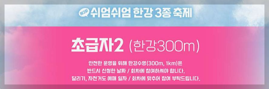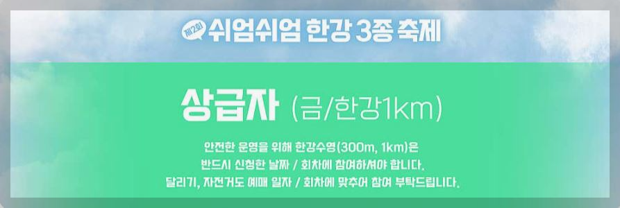 - 인원 집계를 통한 안전한 운영을 위해, 한강 수영(300m, 1km)은 반드시 신청한 날짜/회차에 참여하셔야 합니다.