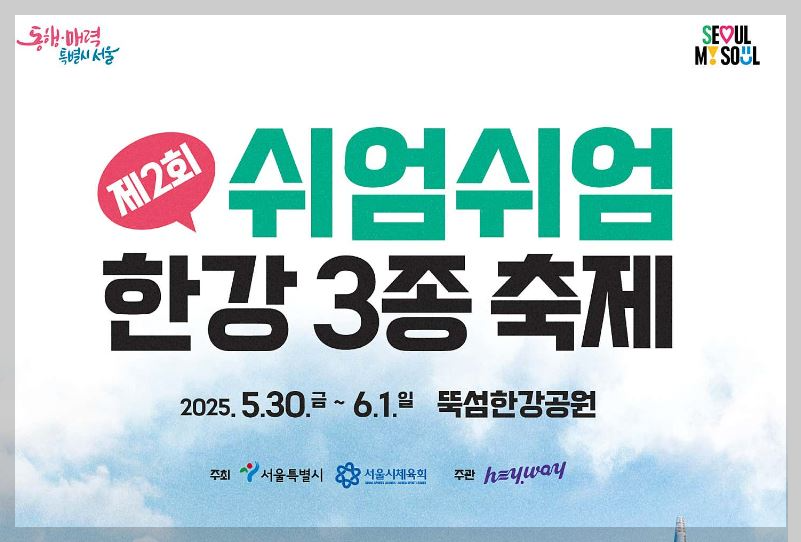 서울시는 시민 누구나 가족·친구·연인과 함께 하루 종일 한강에서 놀며, 쉬며, 즐기는 제2회 쉬엄쉬엄 한강 3종 축제가 올 여름 뚝섬한강공에서 개최된다고 밝혔습니다. 서울시에서는 5월30일부터 6월1일까지 진행되는 제2회 쉬엄쉬엄 한강 3종 축제에서 진행되는 ‘펀(FUN) 체험 프로그램’ 참여자를 5월 9일(금) 오후 2시부터 선착순으로 모집한다고 밝혔으며 ‘제2회 쉬엄쉬엄 한강 3종 축제’는 여름의 시작과 함께 한강에서 3종 경기를 완주하거나 다양한 문화·체육 프로그램을 체험할 수 있는 축제를 준비중입니다. 2025년 ‘펀(FUN) 체험 프로그램’은 시원한 한강에서 즐기는 이색 수상스포츠 체험으로 구성된 ‘한강 풍덩존’과 재미와 스포츠를 겸하는 ‘쉬엄쉬엄 한강 운동회’로 구성되어 있습니다. 평소에 쉽게 접하기 어려운 수상스포츠인 요트, 카약, 수상자전거를 릴레이로 체험할 수 있는 프로그램과 3종 경기 참가자들이 쉽게 물놀이를 즐길 수 있는 ‘워터 놀이터’도 함께 운영한다.