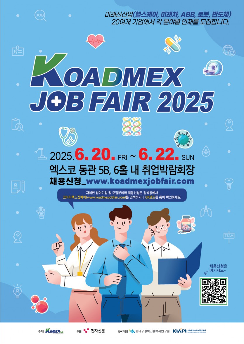 2025 대한민국 국제 첨단 디지털 의료기기 및의료 산업전 취업박람회 올해 잡페어는 미래신산업인 헬스케어, 미래차, ABB, 로봇, 반도체 분야를 이끄는 혁신기업들이 KOADMEX Job Fair 2025에서 우수인재를 찾고있습니다. 채용예정 기업과 구직자가 현장에서 직접 소통하고 채용으로 연계될 수 있는 전문채용박람회에 많은 관심과 참여 부탁드립니다. 기업은 채용분야를 통해 맞춤인재를, 구직자는 참여기업 정보를 통해 면접신청을 진행하시면 됩니다. 이번 2025 코아디멕스 잡페어 박람회에 참가하고자 하시는 분들은 아래 링크를 통해 채용박람회 참여기업및 부대행사, 준비물등 참가방법을 확인 하시기 바랍니다.