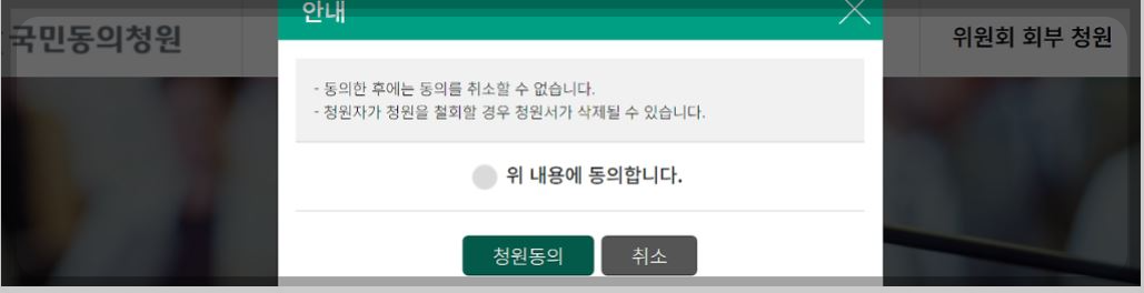 6. 안내에 따라 동의를 취소 할수 없을 확인하시고 동의체크후 청원동의 선택합니다