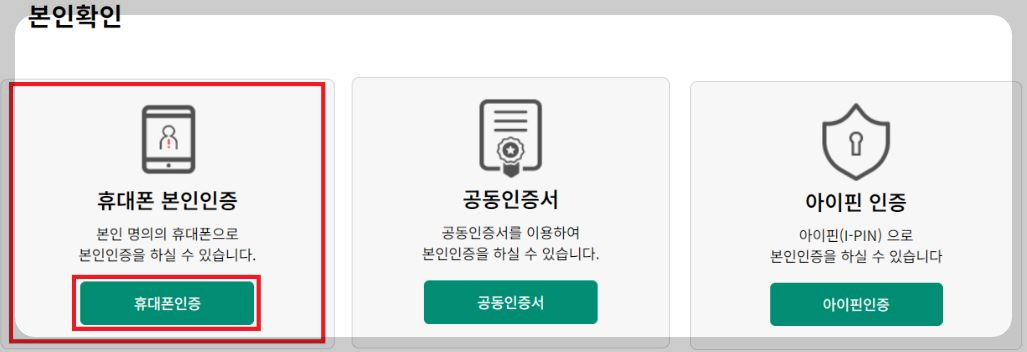 4.본인인증 방식 3가지 중 한가지 방식을 선택하여 진행 하셔야 합니다. 휴대폰을 소지하고 있을시 휴대폰본인인증을 진행합니다.