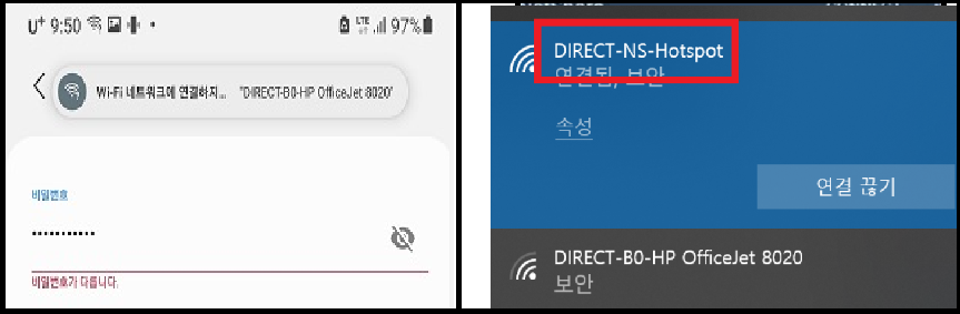 그리고 노트북 와이파이에서 DIRECT-NS-HOTSPOT 와이파이를 연결합니다.