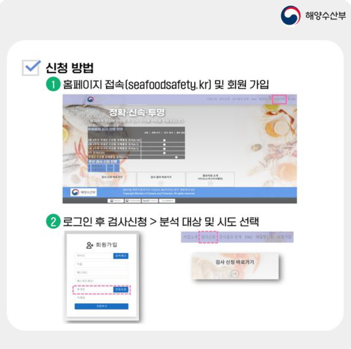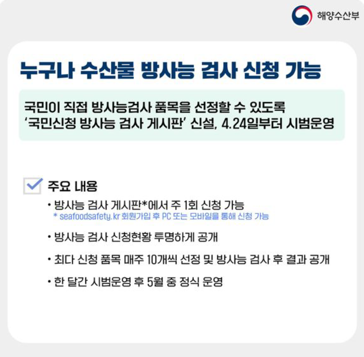 수산물 안전성에 대한 국민적 불안감 해소를 위해 국민이 선택한 폼목을 대상으로 방사능 검사를 실시하고 그 결과를 받아봄으로써 안심하고 섭취 할 수 있도록 정확신속 투명한 정보를 공개하는 해양수산부의 사업입니다,