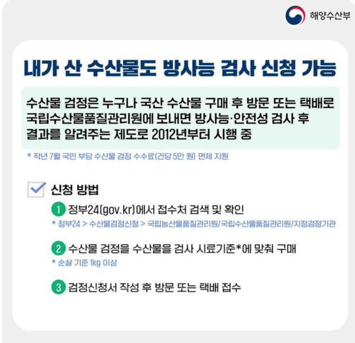 또한 생산단계 수산물 방사능 검사 결과는 해수부 누리집에서 확인할 수 있으며, 생산, 유통, 수입 수산물에 대한 방사능 검사 결과는 식품의약품안전처 누리집에서 확인할 수 있습니다.