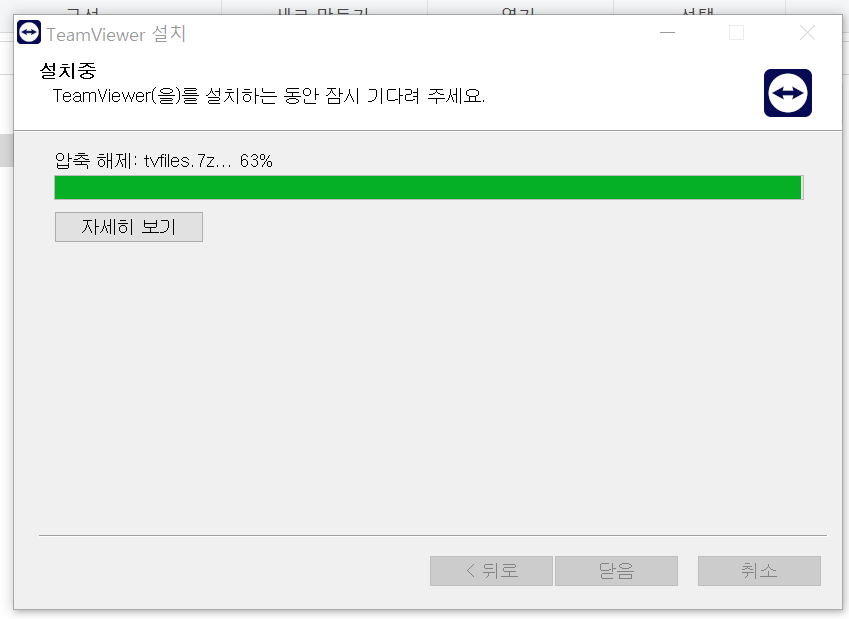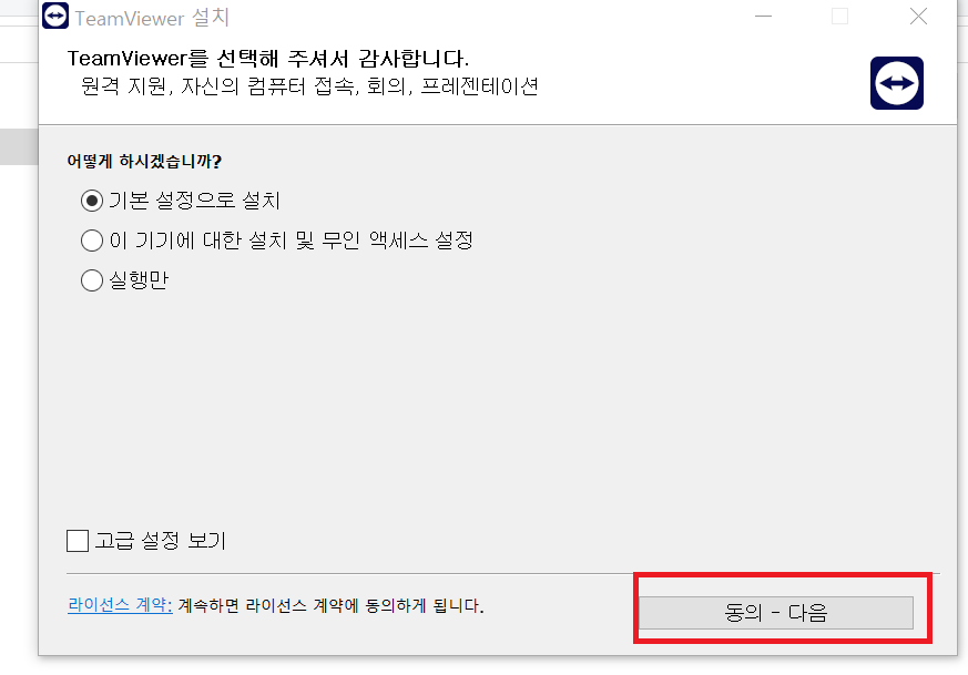 2. 기본 설정으로 설치 - 동의(다음) 클릭'순으로 팀뷰어 다운로드 및 설치 과정을 넘어간다.