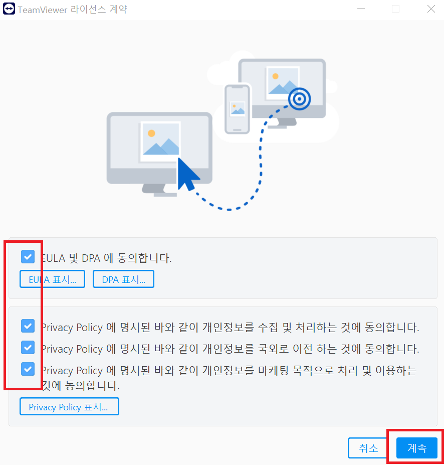 3. 마지막으로, 사용 약관에 동의 - 계속을 선택하면, 팀뷰어 다운로드 및 설치는 끝이다.