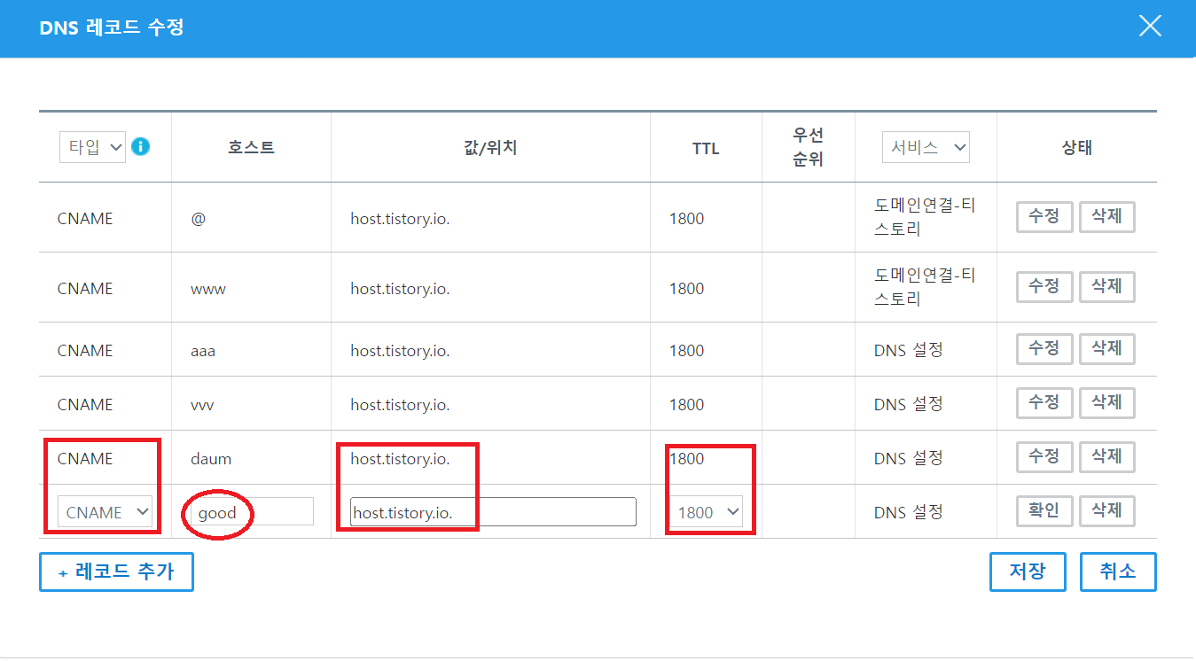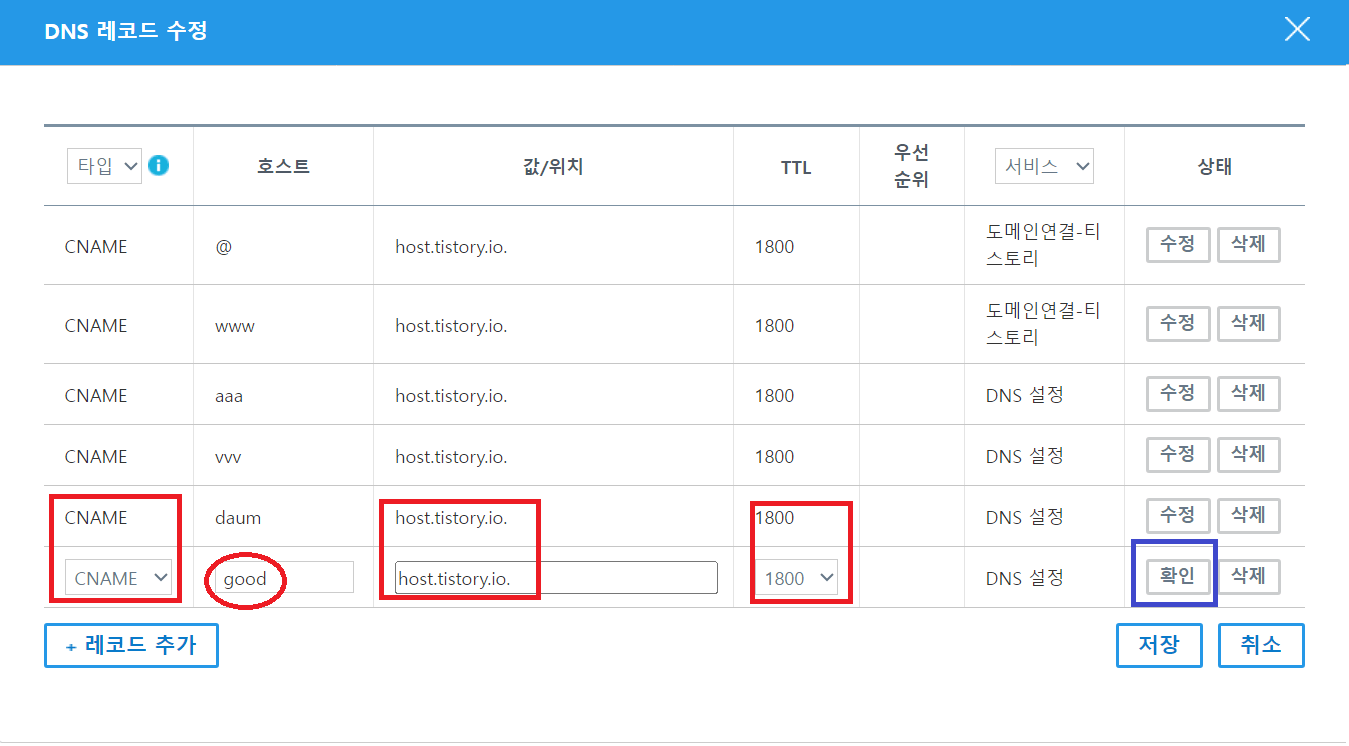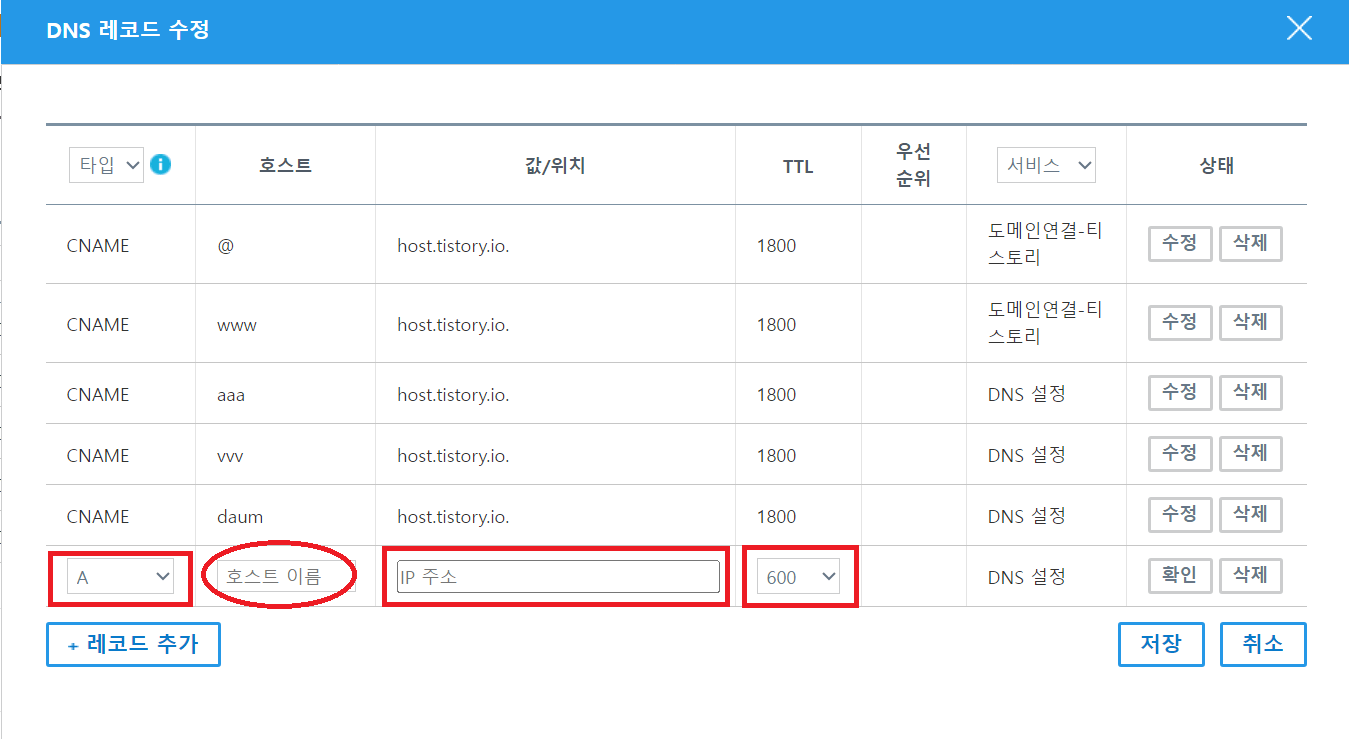 5. 그리고 제가 빨간색 네모 칸 부분은 타입, 값/위치/TTL 모두 DNS와 동일하게 기입해 주시고 빨간색 동그라미 친 호스트이름은 여러분들이 원하는 글자를 넣으시면 됩니다. 숫자로 하셔도 되고 영어로 하셔도 됩니다. 저는 영어로 진행하겠습니다.