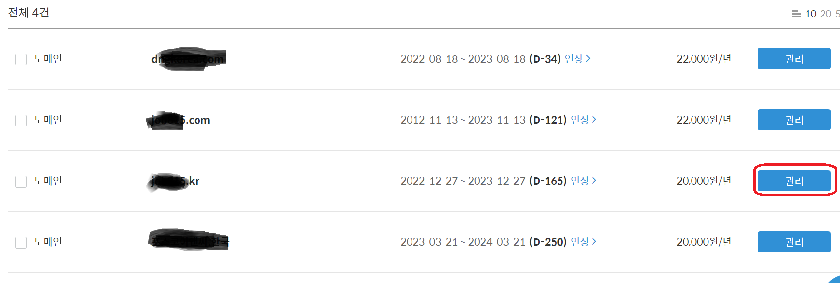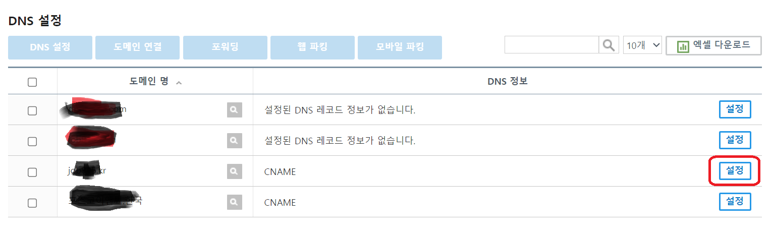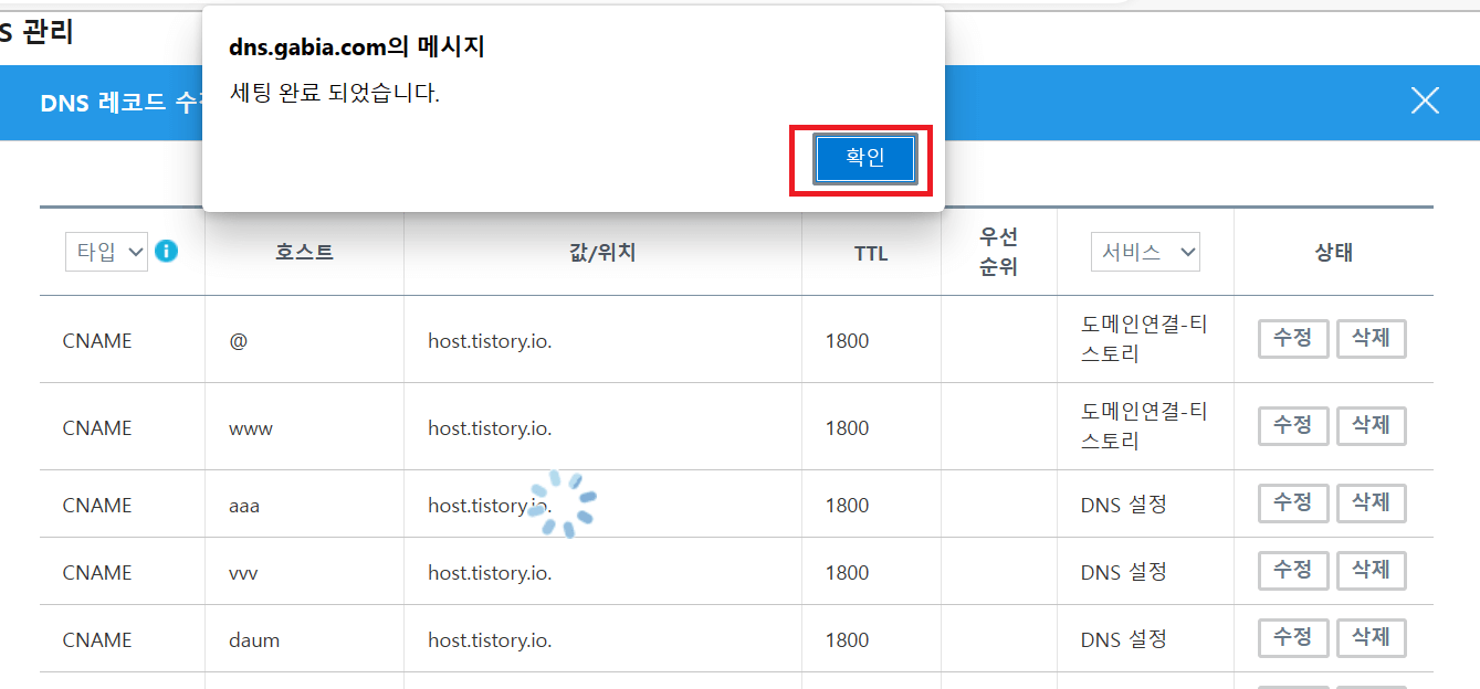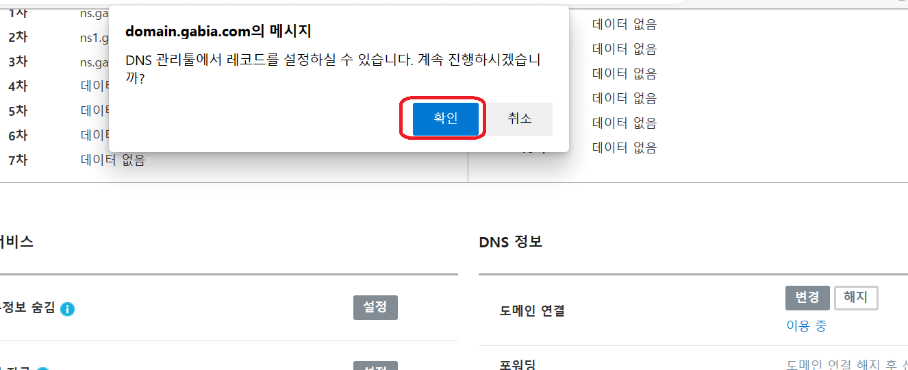 3. 다시 아랫화면처럼 확인을 클릭하고 다시 DNS설정방에서 앞에 선택한 도메인의 설정을 클릭합니다.