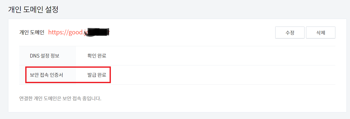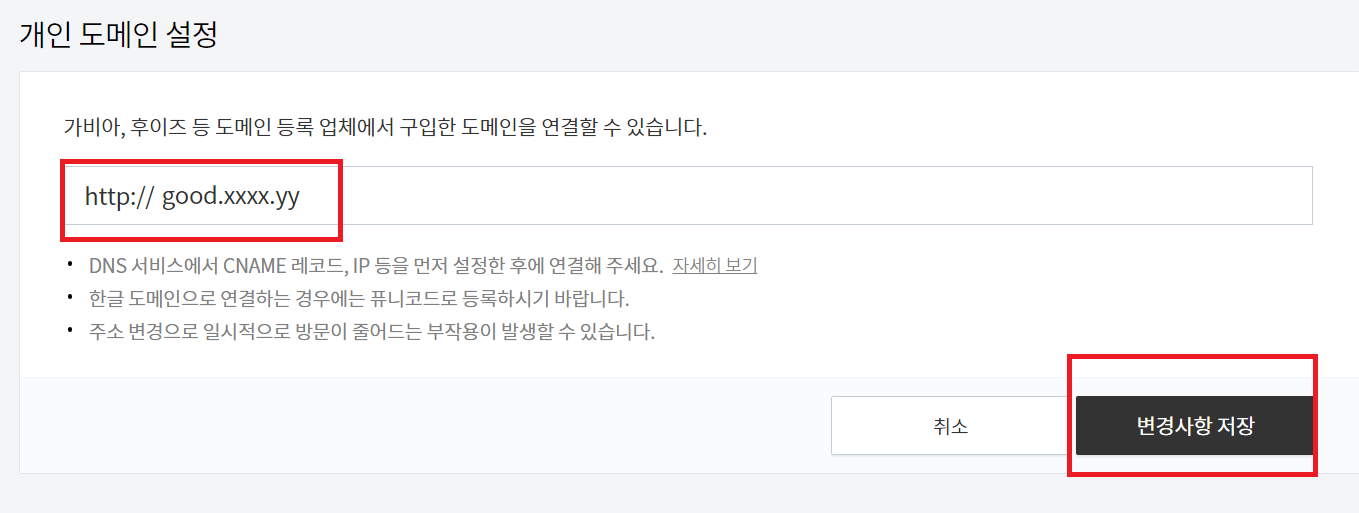 9. 도메인 연결하기 버튼을 클릭하셨다면 개인도메인 설정창이 뜨실 겁니다. https:// 바로 뒤에 방금 가비아에서 생성한 good를(각자가 생성하신 도메인) 넣으시고 중간에 기본도메인을 넣어주면 됩니다. 제대로 기입하셨다면 변경사항저장을 클릭하세요. 이제 티스토리 블로그에 하위도메인이 연동이 완료되었습니다.