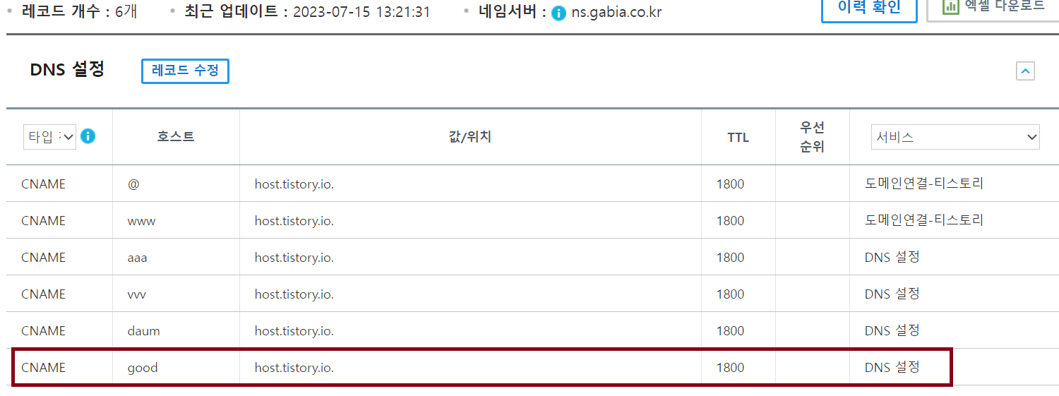 7. 아래처럼 세팅이 완료되었다는 메시지와 함께 하위도메인이 생성된 것을 확인할 수 있습니다. 이것으로 하위도메인생성은 완료되었습니다. 계속티스토리를 하위도메인과 연동하는 것을 진행하겠습니다.