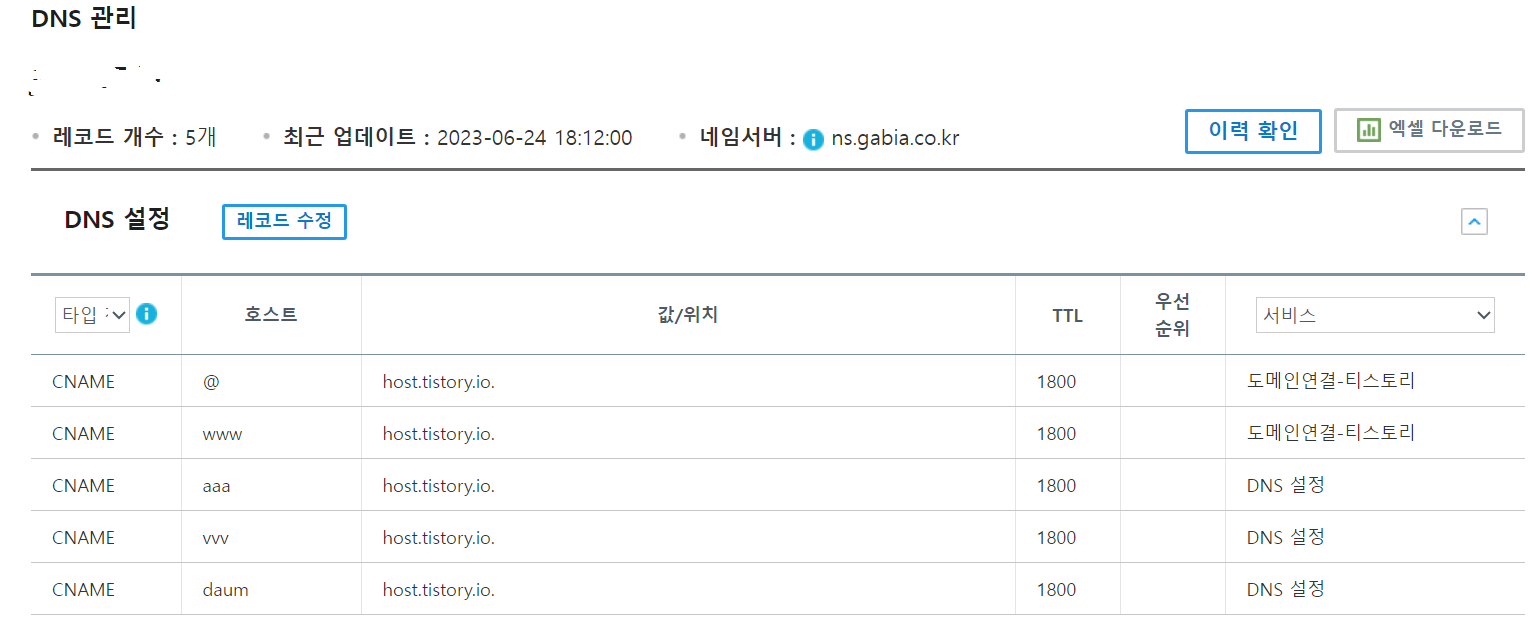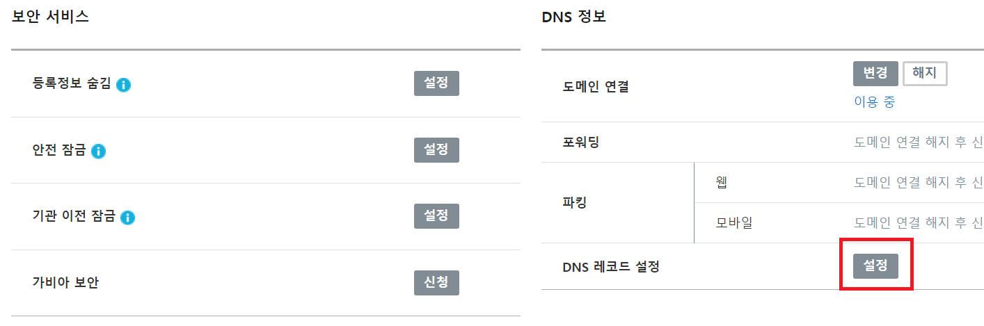 2. 그리고 하위도메인을 생성하고자 하시는 도메인 관리 부분을 클릭한 후 DNS레코드 설정을 클릭합니다.