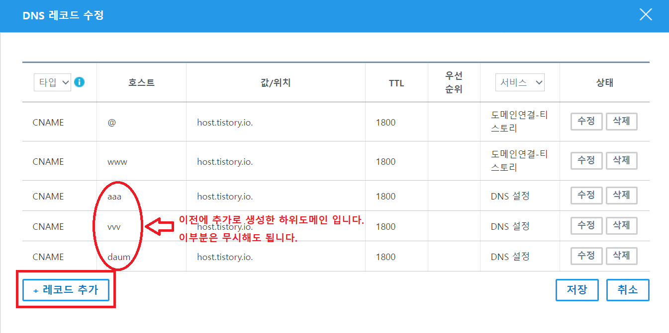 4.DNS설정방에서 아랫부분의 레코드추가를 클릭하시면 됩니다.(적색 부분의 동그란 부분은 저의 하위도메인이니 신경 쓰지 않으셔도 됩니다.)