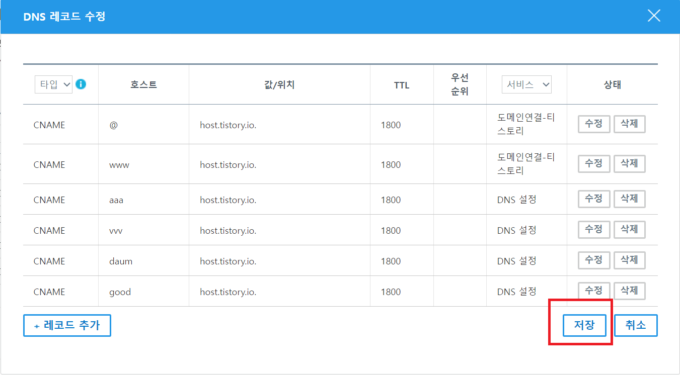 6. 타입, 값/위치/TTL 도두 DNS와 동일하게 기입과 호스트이름을 작성하셨다면 파란색 네모칸의 확인란을 클릭 후에 저장을 클릭하세요.