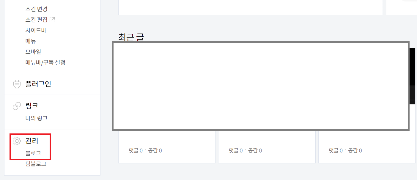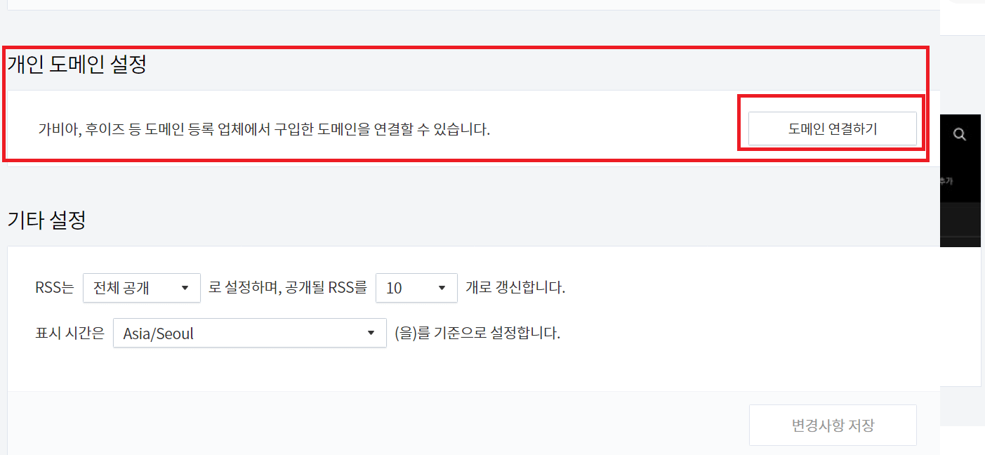 8. 티스토리에 하위도메인을 연동시킬 티스토리계정으로 먼저 로그인을 해주시고 로그인하셨다면 바로 설정창으로 들어가 주세요. 이후 관리탭 블로그로 들어가 주시면 됩니다, 그리고 하단으로 조금 내려가시면 [도메인연결하기] 버튼이 보이실 겁니다. 그 버튼을 클릭해 주세요.