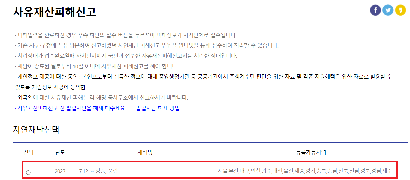 [국민재난안전포털] 현재 사이트에 따르면 2023년 7월에 발생한 호우, 강풍, 풍랑, 폭염 등 이상기후로 인한 수해피해 재난지원금 신청이 가능합니다. 신청 가능 지역으로는 서울, 부산, 대구, 인천, 광주, 대전, 울산, 세종, 경기, 강원, 충북, 충남, 전북, 전남, 경북, 경남, 제주 어디든 상관없다고 해요.