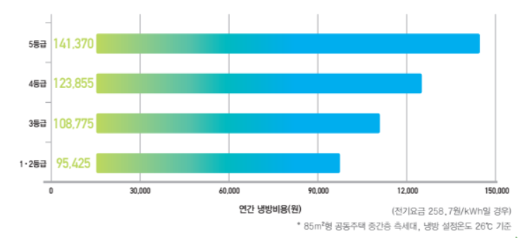 에어컨도 제품의 냉방효율에 따라 15등급의 에너지효율등급이 표시됩니다. 1등급인 제품과 5등급인 에어컨을 사용할 때 냉방비용은 약 46000원 정도 차이가 나며 주택용 전력의 전기요금은 누진요 급제도가 시행되고 있으므로 그 차이는 더더 욱 커질 수 있습니다.