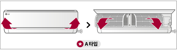 A Type 에어컨의 앞면의 양쪽을 잡고 위로 열어주는 모습 / 에어컨의 필터를 아래로 당겨 꺼내는 모습