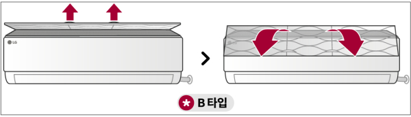 B Type 에어컨의 상단부 필터를 위로 들어 분리하는 모습