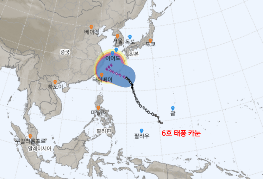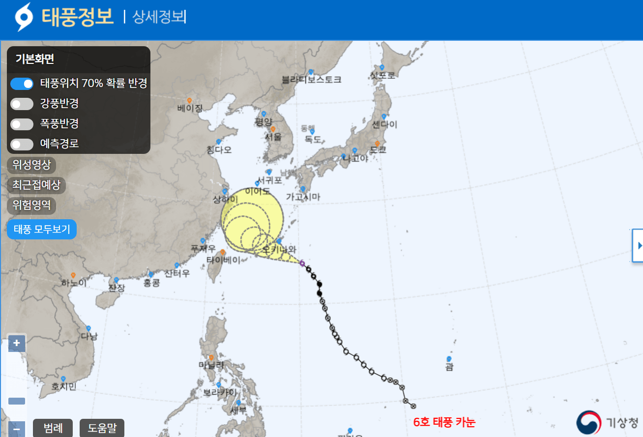 태풍의 경로를 TV, 라디오 등을 통해 기상정보를 청취하여 내가 있는 지역의 상황을 지속적으로 파악하시거나 아래링크를 통해 현 시간 태풍경로를 확인하여 미연에 사고예방 하는 것도 좋은 방법입니다.