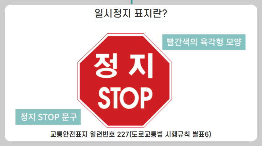 차량이 일시정지해야 하는 교차로나 기타 필요한 장소에 설치된 일시정지 표지. 운전 중 도로 위에서 일시정지 표지를 발견하면 바퀴를 완전히 정지하고 좌우를 살피며 약 3초만 기다려 주세요.